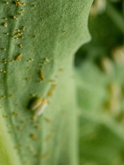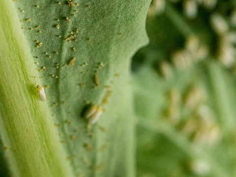 Tiny, white sap-sucking bugs called whiteflies find as much comfort in the warm and humid conditions of P’Petual’s greenhouses as the vegetables that Andrew is growing to put on grocery store shelves, and they eat the vegetables too. And that’s why whiteflies are a threat to the quality and quantity of harvest, especially difficult to control during their rapid reproduction cycles in the warmer months.