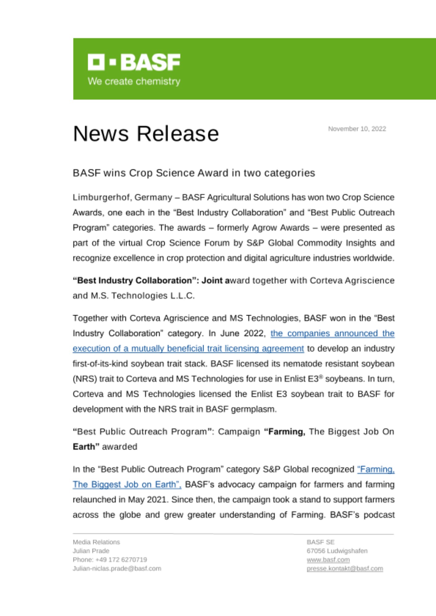 Together with Corteva Agriscience and MS Technologies, BASF won in the “Best Industry Collaboration” category. In June 2022, the companies announced the execution of a mutually beneficial trait licensing agreement to develop an industry first-of-its-kind soybean trait stack. BASF licensed its nematode resistant soybean (NRS) trait to Corteva and MS Technologies for use in Enlist E3® soybeans. In turn, Corteva and MS Technologies licensed the Enlist E3 soybean trait to BASF for development with the NRS trait in BASF germplasm.