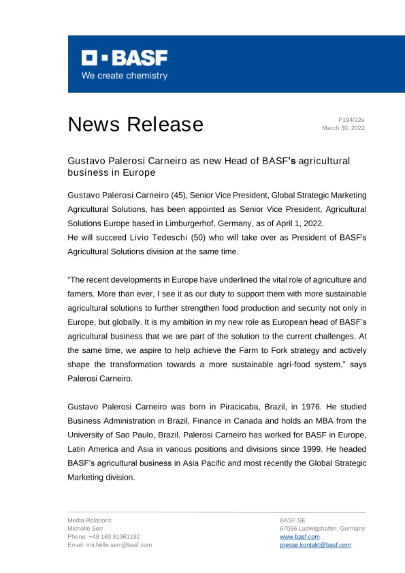 Gustavo Palerosi Carneiro (45), Senior Vice President, Global Strategic Marketing Agricultural Solutions, has been appointed as Senior Vice President, Agricultural Solutions Europe based in Limburgerhof, Germany, as of April 1, 2022, heading BASF’s agricultural business in the region EMEA and CIS.