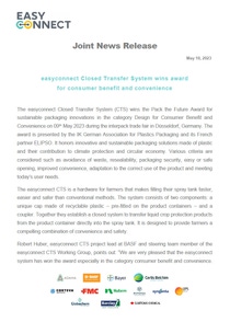 The easyconnect Closed Transfer System (CTS) wins the Pack the Future Award for sustainable packaging innovations in the category Design for Consumer Benefit and Convenience on 09th May 2023 during the interpack trade fair in Düsseldorf, Germany. The award is presented by the IK German Association for Plastics Packaging and its French partner ELIPSO. It honors innovative and sustainable packaging solutions made of plastic and their contribution to climate protection and circular economy. Various criteria are considered such as avoidance of waste, resealability, packaging security, easy or safe opening, improved convenience, adaptation to the correct use of the product and meeting today’s user needs.