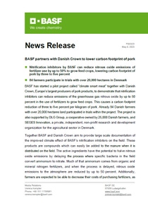 BASF has started a pilot project called “climate smart meat” together with Danish Crown, Europe’s largest producers of pork products, to demonstrate that nitrification inhibitors can reduce emissions of the greenhouse gas nitrous oxide by up to 50 percent in the use of fertilizers to grow feed crops. This causes a carbon footprint reduction of three to five percent per kilogram of pork. Already 84 Danish farmers with over 20,000 hectares land participated in trials within the project. The project is also supported by DLG Group, a cooperative owned by 25,000 Danish farmers, and SEGES Innovation, a private, independent, non-profit research and development organization for the agricultural sector in Denmark.