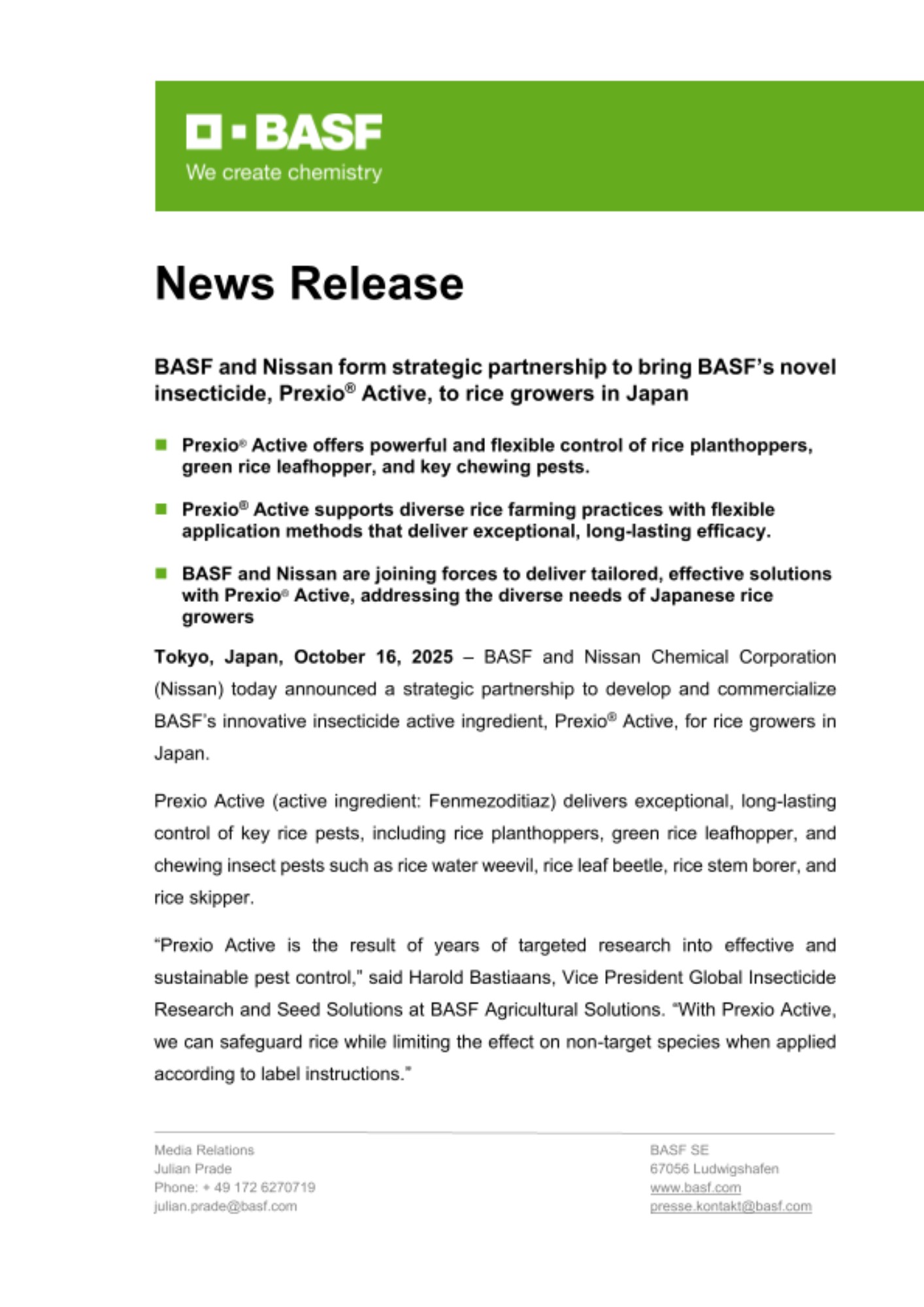 - BASF and Nissan are joining forces to deliver tailored, effective solutions with Prexio® Active, addressing the diverse needs of Japanese rice growers